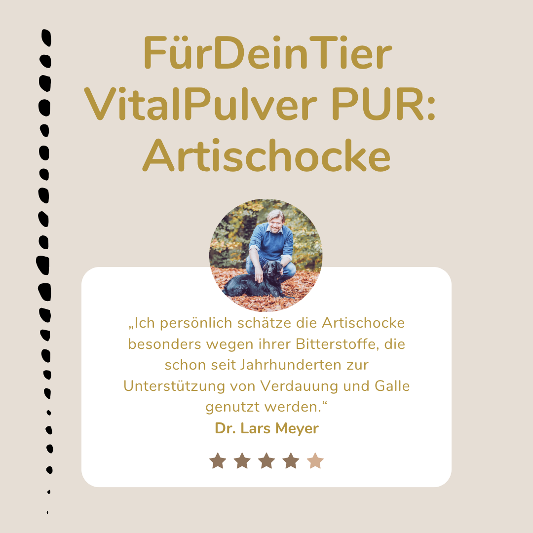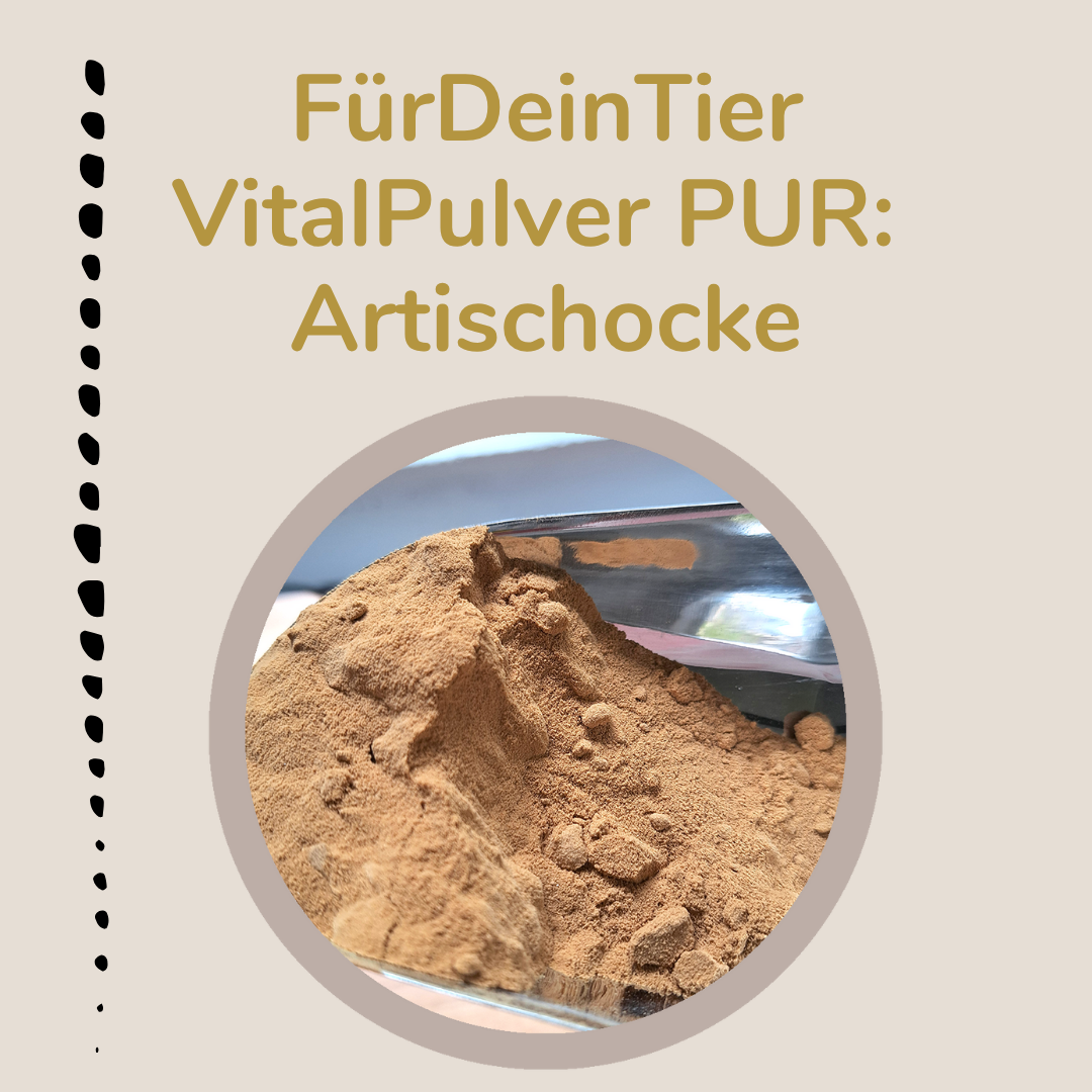 Artischocken-Vitalpulver kann direkt unter das tägliche Futter gemischt oder mit etwas Wasser angerührt werden. Bei der ersten Gabe mit einer kleinen Menge beginnen und über einige Tage auf die Zielration steigern.