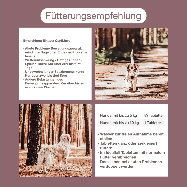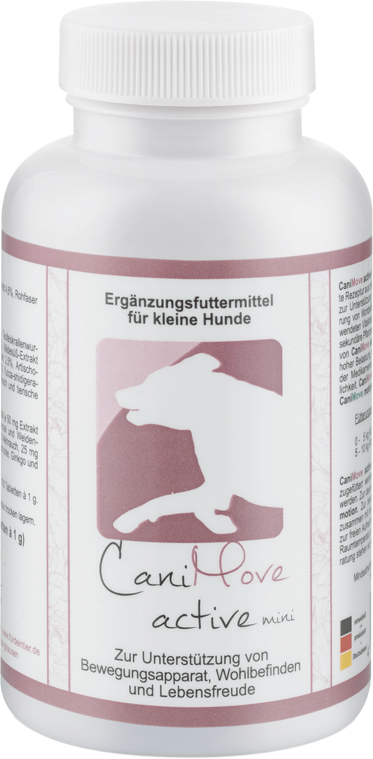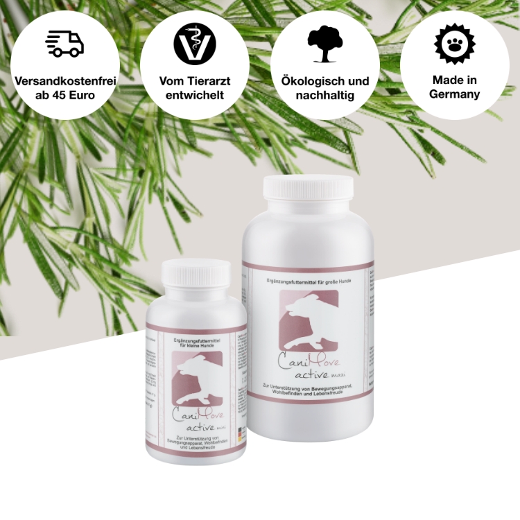 Hinweis: CaniMove active ersetzt keinen Tierarztbesuch und keine tierärztlichen Schmerzmittel. Akute Lahmeheitsphasen aufgrund von Arthrose, HD, ED, Arthritis, rheumatischen Erkrankungen oder Spondylosen sind ernste Erkrankungen und sollten schulmedizinisch behandelt werden. Wir beraten Sie gerne: info@fuerdeintier.de.