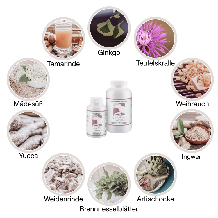 CaniMove active ist eine schonend in Tablettenform gepresste Rezeptur aus zehn Vitalkräuter-Extrakten. Es wurde speziell zur Unterstützung des Bewegungsapparates und zur Förderung von Wohlbefinden und Lebensfreude entwickelt. Die verwendeten Vitalkräuter enthalten wertvolle Mikronährstoffe sowie sekundäre Pflanzeninhaltsstoffe und werden traditionell bei Problemen des Bewegungsapparates empfohlen. DIe enthaltenen Vitalkräuter Brennnesselblätter, Teufelskralle, Weidenrinde, Weihrauch, Mädesüß, Ingwer, Artischocken, Ginkgo, Yucca und Tamarinde werden aufgrund ihrer sekundären Pflanzeninhaltsstoffe (Saponine, Flavonoide, Gerbstoffe, etc.) und der enthaltenen Vitamine und Spurenelemente seit jeher geschätzt.