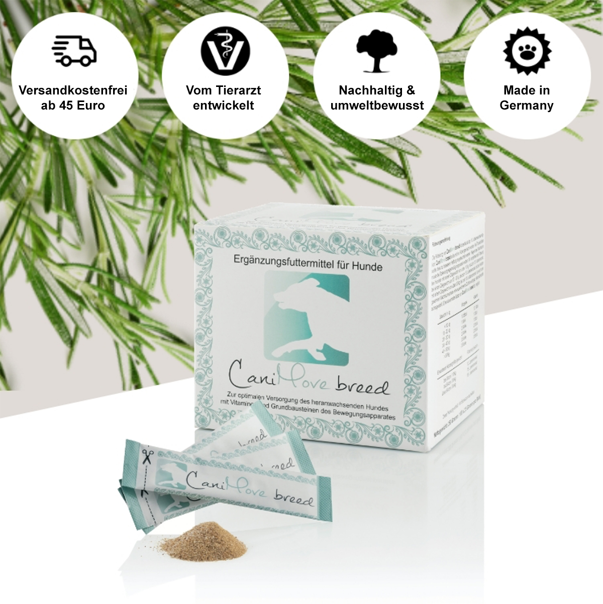 CaniMove breed stellt dem heranwachsenden Hund wichtige Vitamine, Mengen- und Spurenelemente sowie Mikronährstoffe zur Verfügung. So kann das Wachstum jedes Jungtieres optimal unterstützt und Mangelerscheinungen vorgebeugt werden.