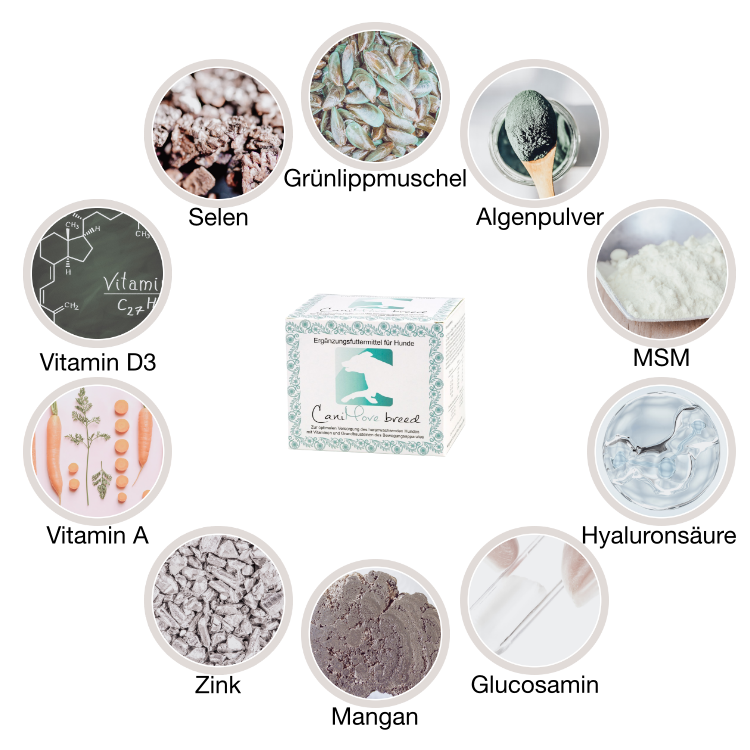 Grünlippmuschelpulver ist reich an Omega-3-Fettsäuren sowie Glycosaminoglycanen. Glucosamin ist der natürliche Grundbaustein des Gelenkknorpels und von entscheidender Bedeutung für den Aufbau der Gelenke. MSM (Methylsulfonylmethan) ist eine biologische Schwefelquelle; Schwefel wird für viele wichtige Körperfunktionen benötigt. Hochmolekulare Hyaluronsäure zeichnet sich durch eine nachgewiesene Bioverfügbarkeit aus: Hyaluronsäure bildet die Grundlage der Synovia, der sogenannten „Gelenkschmiere“. DHA wird vom Organismus für die Entwicklung von Augen und Hirn benötigt. Die enthaltenen Vitamine A, B, C, D und E sind bedarfsdeckend zugesetzt und können eventuelle Mangelerscheinungen effektiv verhindern. Zink und Mangan werden vom Organismus in ausreichender Menge für eine gesunde Entwicklung von Skelett-, Haut, Horn und Fell benötigt.