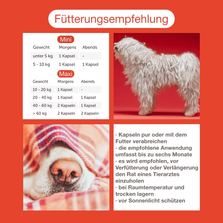 Kapseln pur oder mit dem Futter verabreichen.