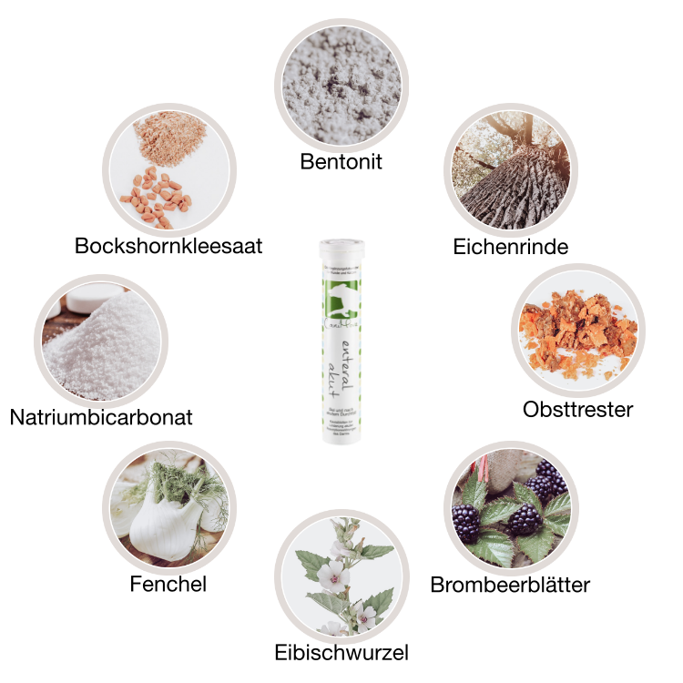 - Vitalkräuter (Eichenrinde, Fenchel, Brombeerblätter, Eibischwurzel, Kamillenkraut, Heidelbeerblätter, Süßholzwurzel, Bockshornklee und Anissaat) enthalten nützliche Gerb- und Schleimstoffe. Diese Stoffe sollen die physiologische Selbstreinigung des Magen-Darm-Traktes unterstützen.