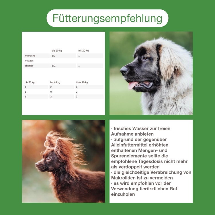 Frisches Wasser zur freien Aufnahme anbieten. Aufgrund der gegenüber Alleinfuttermittel erhöhten enthaltenen Mengen- und Spurenelemente sollte die empfohlene Tagesdosis nicht mehr als verdoppelt werden. Die gleichzeitige Verabreichung von Makroliden ist zu vermeiden. Es wird empfohlen vor der Verwendung tierärztlichen Rat einzuholen.