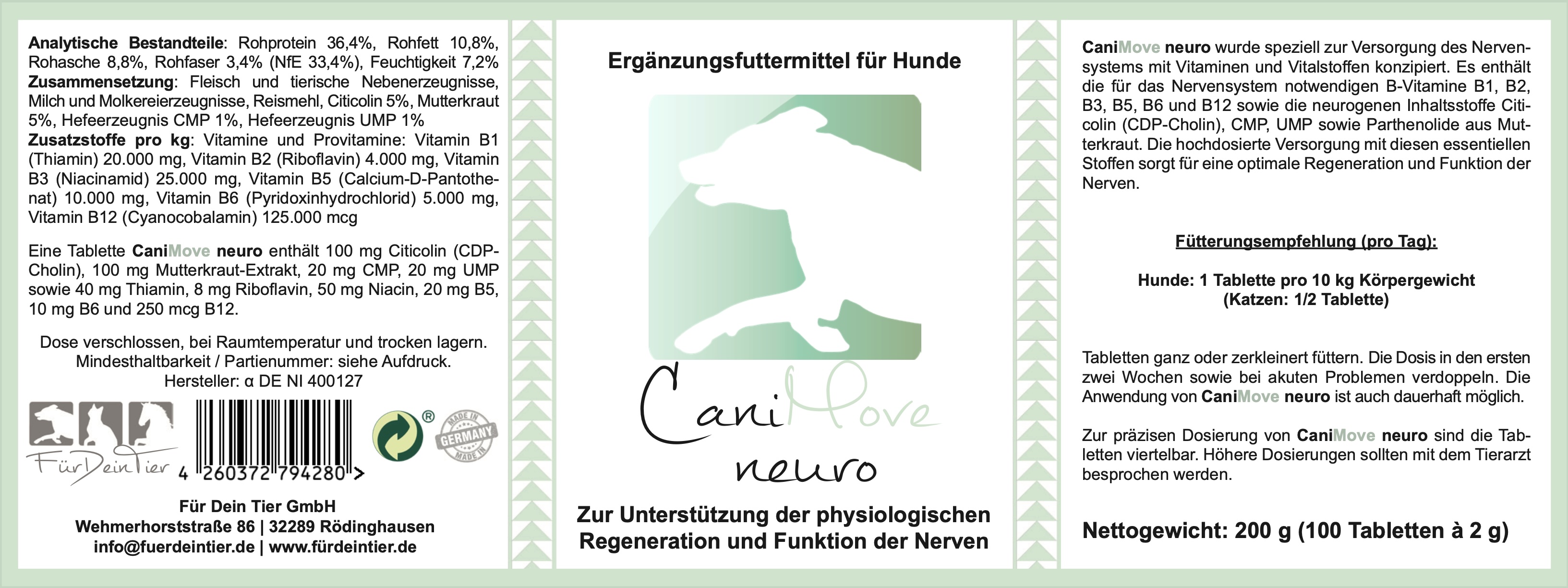 Eine Tablette CaniMove neuro enthält 100 mg Citicolin (CDP- Cholin), 100 mg Mutterkraut-Extrakt, 20 mg CMP, 20 mg UMP sowie 40 mg Thiamin, 8 mg Riboflavin, 50 mg Niacin, 20 mg B5, 10 mg B6 und 250 mcg B12.