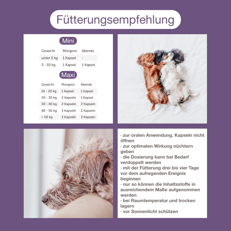 Mit der Fütterung drei bis vier Tage vor dem aufregenden Ereignis beginnen. Nur so können die Inhaltsstoffe von CaniMove relax mini in ausreichendem Maße aufgenommen werden.