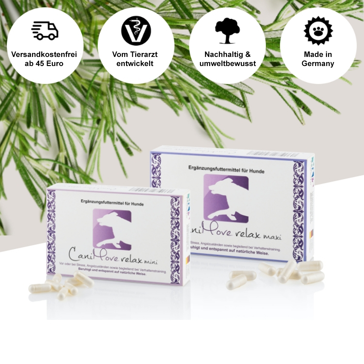 CaniMove relax ist ein beruhigendes Ergänzungsfuttermittel für Hunde und Katzen. Es hilft mit Unruhe oder Angst verbundenes Verhalten zu reduzieren. So können sich Tiere besser beruhigen und Stresssituationen wie lange Autofahrten, Feuerwerk (Silvester), Tierarztbesuche, laute Geräsuche oder ungewohnte Umgebungen besser verarbeiten. Alle Inhaltsstoffe sind in präzise vorgegebenen und transparent ausgezeichneten Mengen enthalten und ausgezeichnet verträglich.