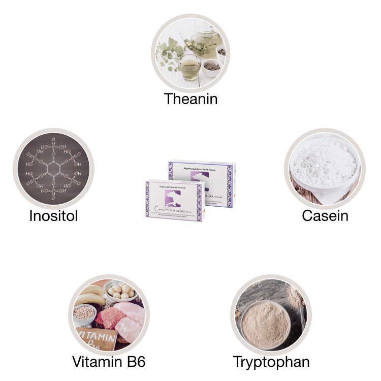 Jede Kapsel CaniMove relax mini ist magensaftresistent und enthält 100 mg Casein, 100 mg Tryptophan, 30 mg Vitamin B6, 25 mg L-Theanin und 20 mg Inositol. Die Kombination dieser Wirkstoffe ist speziell auf die Neuro-Physiologie des Hundes abgestimmt.