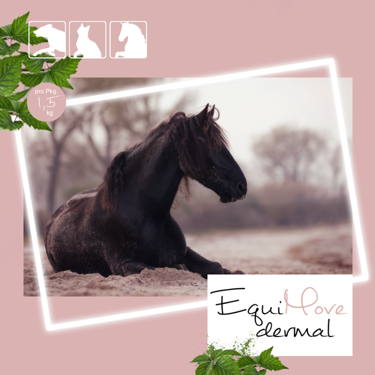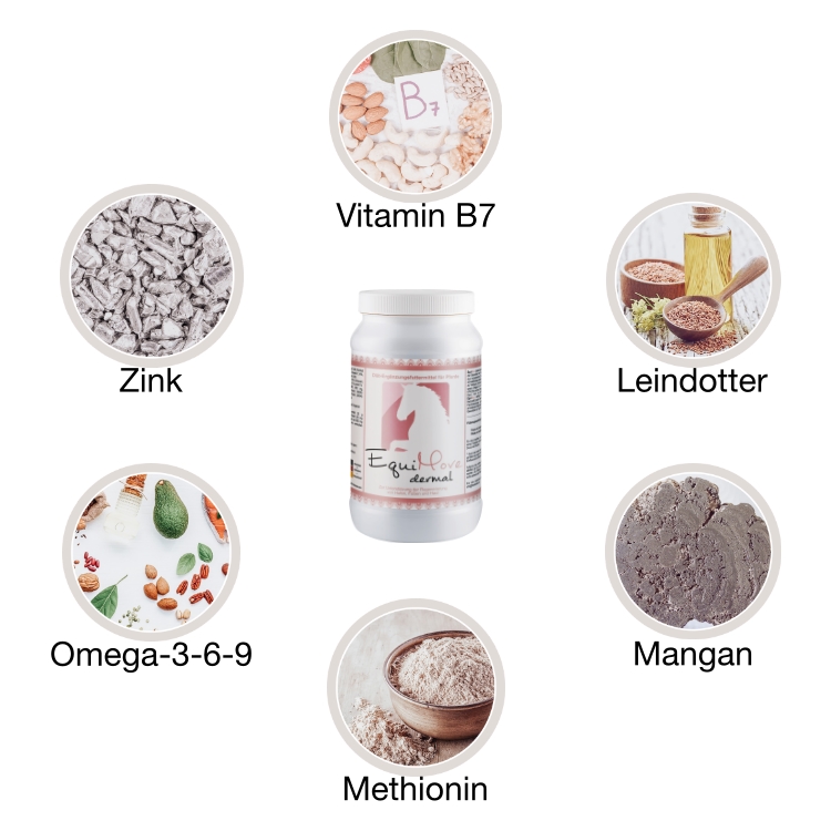 Unser neues EquiMove dermal wurde enthält hochdosierte Mikronährstoffe und innovative orthomolekulare Substanzen. Der exklusive Kräuterkomplex aus Schwarzem Reis (Oryza sativa) und Kaktusfeige (Opuntia ficus indica) ist standardisiert und wurde in Studien auf seine Wirksamkeit auf die Haut untersucht. Die Inhaltsstoffe enthalten Anthocyanidine und Flavonoide mit positiven Wirkungen auf verschiedene Bereiche der Haut. Hochdosiertes Biotin (Vitamin B7) ist das B-Vitamin, welches einen speziellen Bezug zur Haut und den Hautanhangsorganen hat: Biotin sorgt für eine Neubildung von Haarwurzeln (Haarfollikel) und fördert das Nachwachsen von Horn. Das in EquiMove dermal enthaltene Spurenelemente Zink und Mangan sind organisch gebunden ("Chelate") und zeichnen sich durch besonders hohe Bioverfügbarkeit aus. Zink und Mangan sind für das Wachstum von Haut, Fell und Horn absolut notwendig und werden für zahlreiche Enzyme sowie Stoffwechselprozesse benötigt. Methionin ist eine schwefelhaltige Aminosäure und ist im Organismus der wohl wichtigste Schwefel-Spender: Schwefel wird für zahlreiche Prozese in der Haut und dem Bindegewebe sowie für Keratin benötigt. Das Carotinoid Lycopin ist ein vor allem in Tomaten vorkommender Pflanzen-Farbstoff. Lycopin wird für den antioxidativen Schutz in der Haut geschätzt. Hochkonzentrierte Omega-3-Fettsäuren mariner Herkunft liefern die essentiellen Fettsäuren EPA und DHA. Sowohl EPA als auch DHA sind die ungesättigten Fettsäuren, von denen Haut und Hufe am ehesten profitieren können.