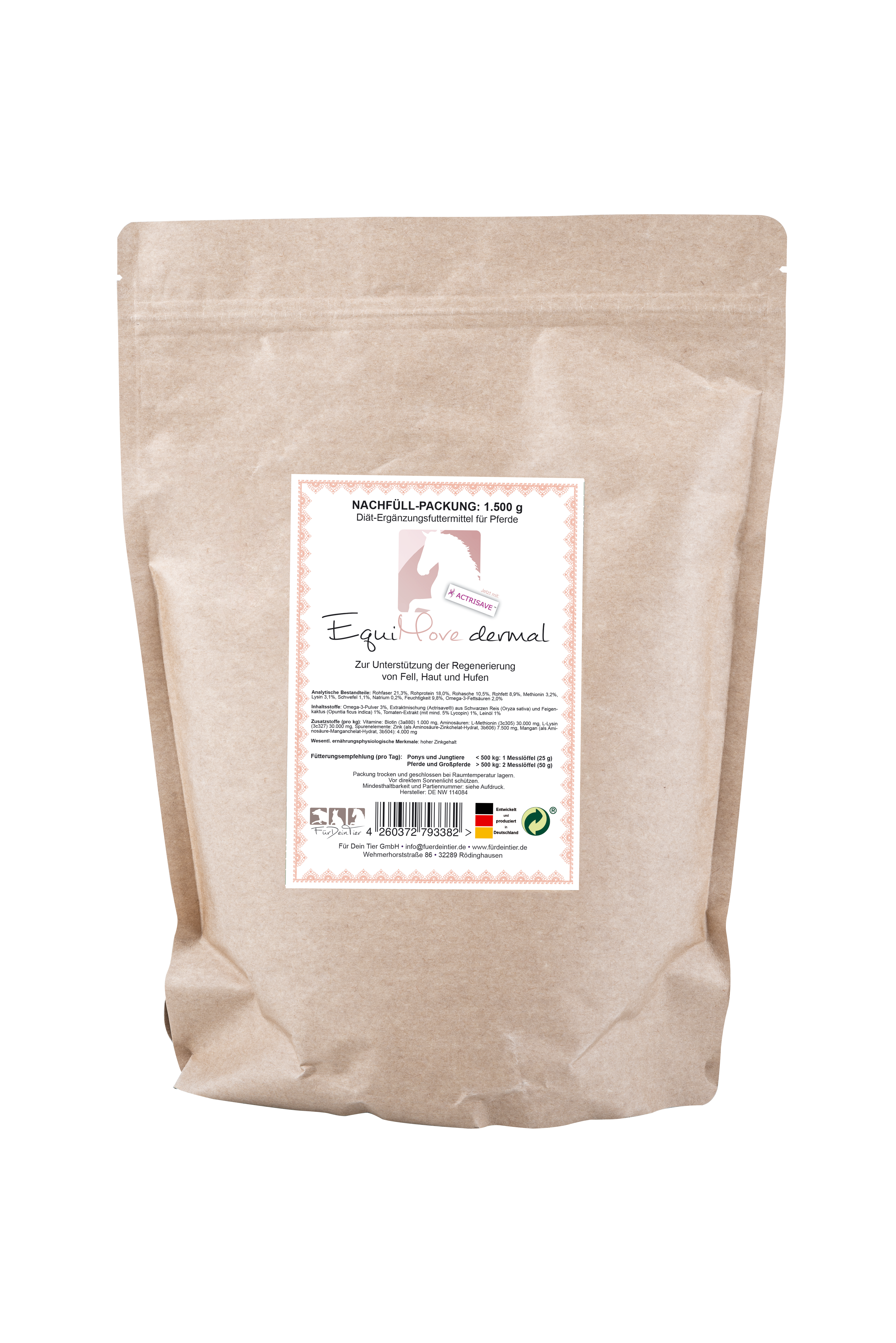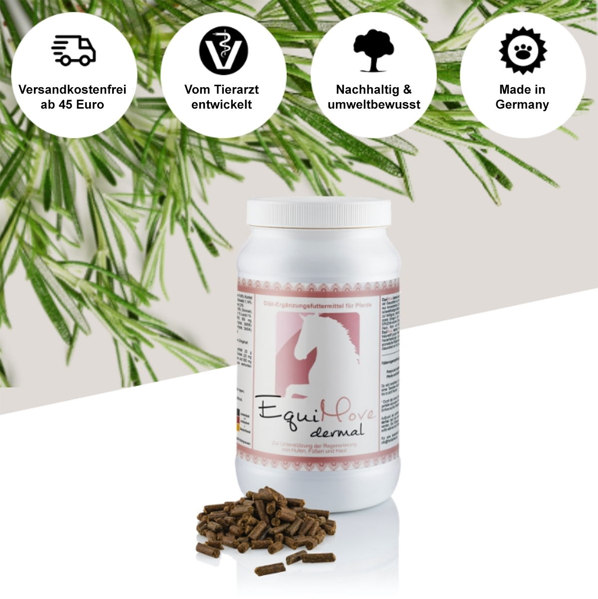 EquiMove dermal ist ideal geeignet für alle Pferde mit schlechter Hornqualität, brüchigem oder weichem Horn der Hufe sowie schlechtem Hufwachstum. Auch während des Fellwechsels, bei brüchigem, stumpfen Fell oder schuppiger Haut ist es eine ausgezeichnete Ergänzung der Fütterung. EquiMove dermal kann auch an gesunde Tiere zur Aufrechterhaltung einer guten Fell- und Hornqualität verfüttert werden sowie zur Steigerung von Fellglanz und Wohlbefinden.