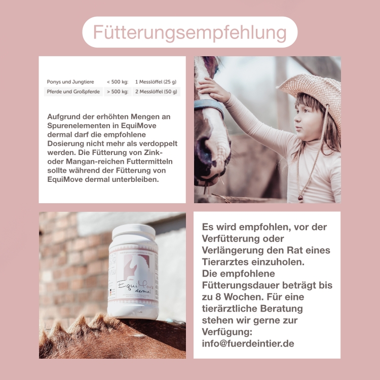 HINWEIS: Aufgrund der erhöhten Mengen an Spurenelementen in EquiMove dermal darf die empfohlene Dosierung nicht mehr als verdoppelt werden. Die Fütterung von Zink- oder Mangan-reichen Futtermitteln sollte während der Fütterung von EquiMove dermal unterbleiben.