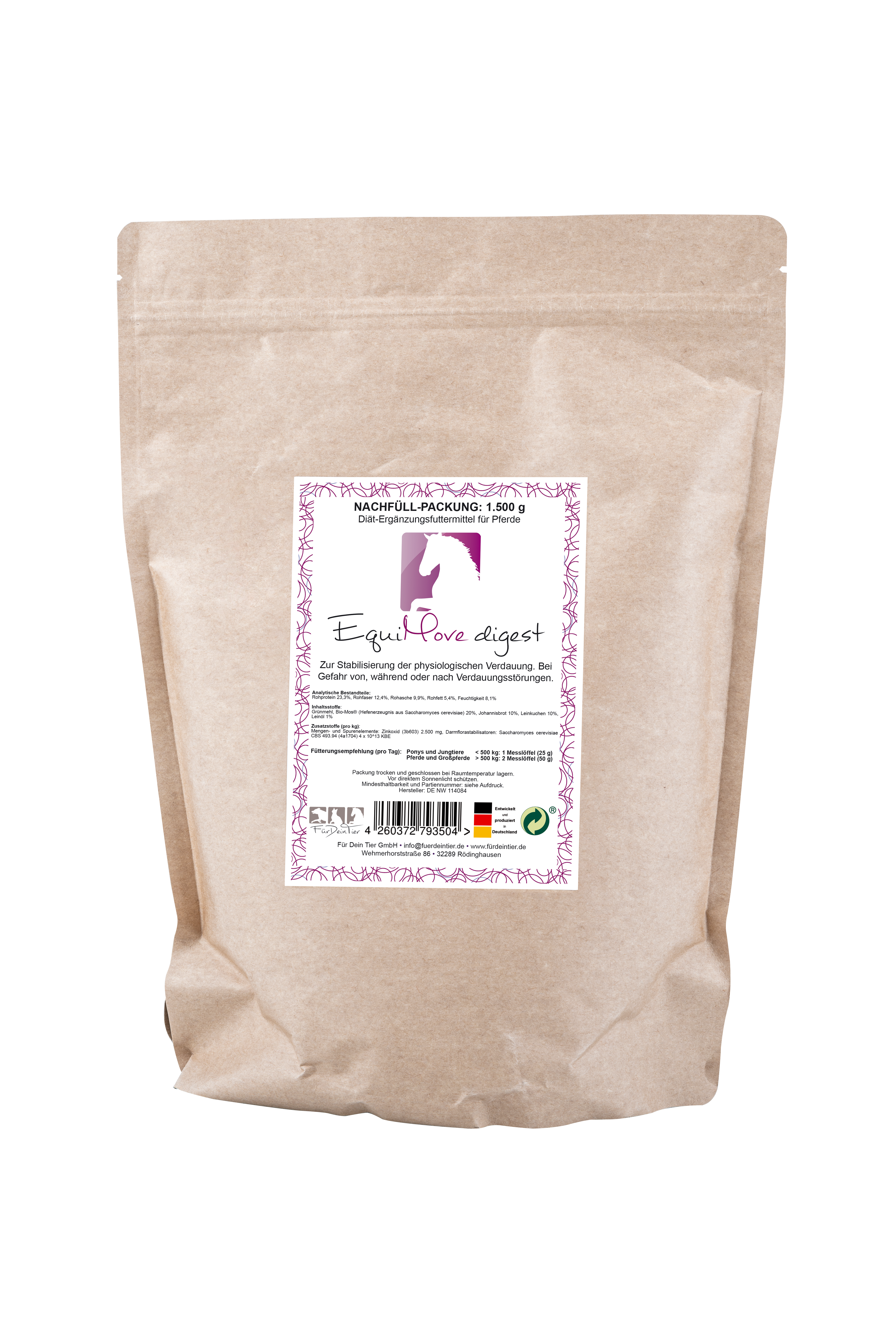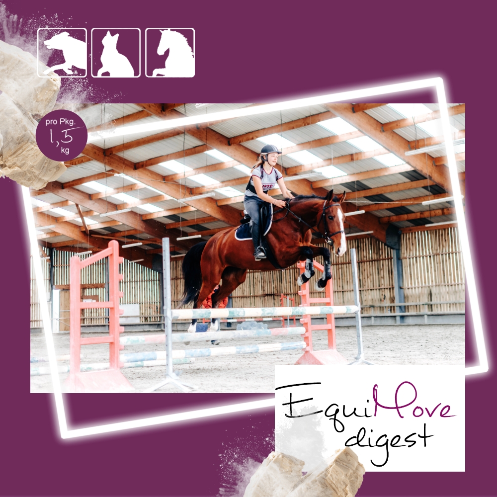 Das neue EquiMove digest ist ein Diät-Ergänzungsfuttermittel speziell zur unterstützenden Fütterung bei Verdauungsstörungen, zu welchen Durchfälle oder Kotwasser gezählt werden können. Derartige Störungen treten im Rahmen von Erkrankungen sowie als Begleiterscheinungen von Medikamentengaben (z.B. Wurmkuren, Antibiotika, etc.) wie auch bei Stress auf.