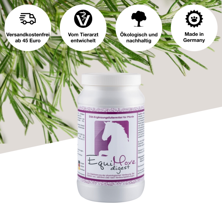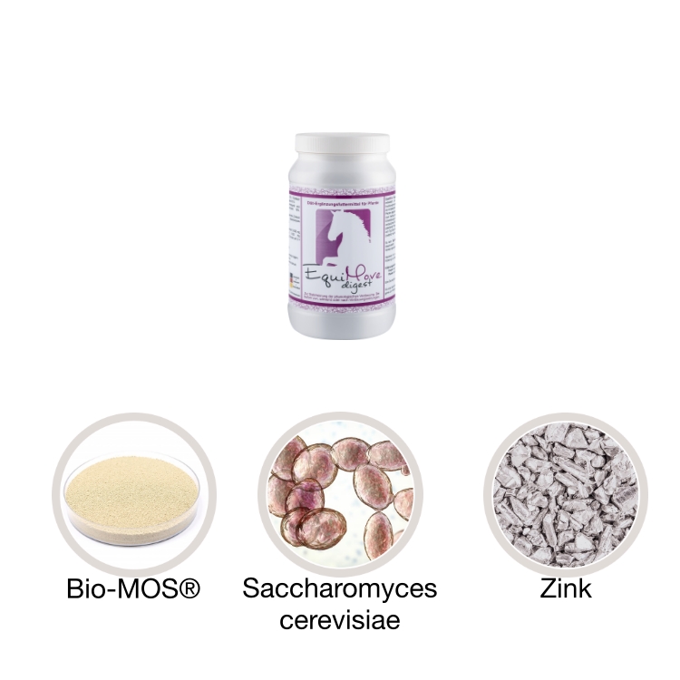 Der Stabilisierung der Darmflora kommt bei einer gestörten Verdauung des Pferdes eine entscheidende Bedeutung zu, schließlich sind Pferde und Ponys auf ein gesundes und ausgeglichenes Mikrobiom angewiesen. Aus diesem Grund enthält EquiMove digest eine einzigartige Kombination aus Präbiotika ("Nährstoffen für die Darmflora"), "Probiotika" ("Gutartigen Mikroorganismen"), Mineralstoffen und verdauungsfördnernden Pflanzen.