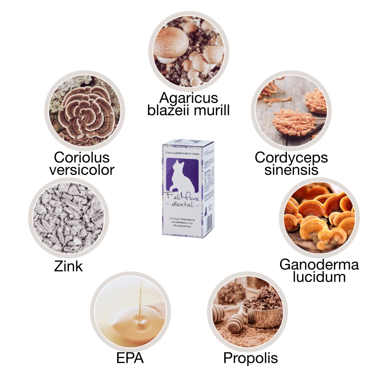 Um das komplexe Organsystem der Maulhöhle und dessen physiologische Abwehrfunktion mit speziellen Nährstoffen zu versorgen, haben wir FeliMove dental entwickelt. Eine auf Malz basierende und deshalb gerne aufgenommene Grundsubstanz verbinden wir mit der hochkonzentrierten, 70-%igen Omega-3-Fettsäure EPA, einem besonderen Komplex aus Vitalpilzen (Ganoderma lucidum, Coriolus versicolor, Cordyceps sinensis sowie Agaricus blazeii murill), dem Bienenkittharz Propolis, Zink in organischer Chelatform sowie Vitamin C. Durch diese einzigartige Kombination hochwertiger, in Deutschland verarbeiteter Pilze, EPA, organischem Zink, Vitamin C und Propolis kann FeliMove dental die Versorgung der Maulhöhle mit wertvollen Mikronährstoffen verbessern und die physiologische Funktion des Immunsystems unterstützen.