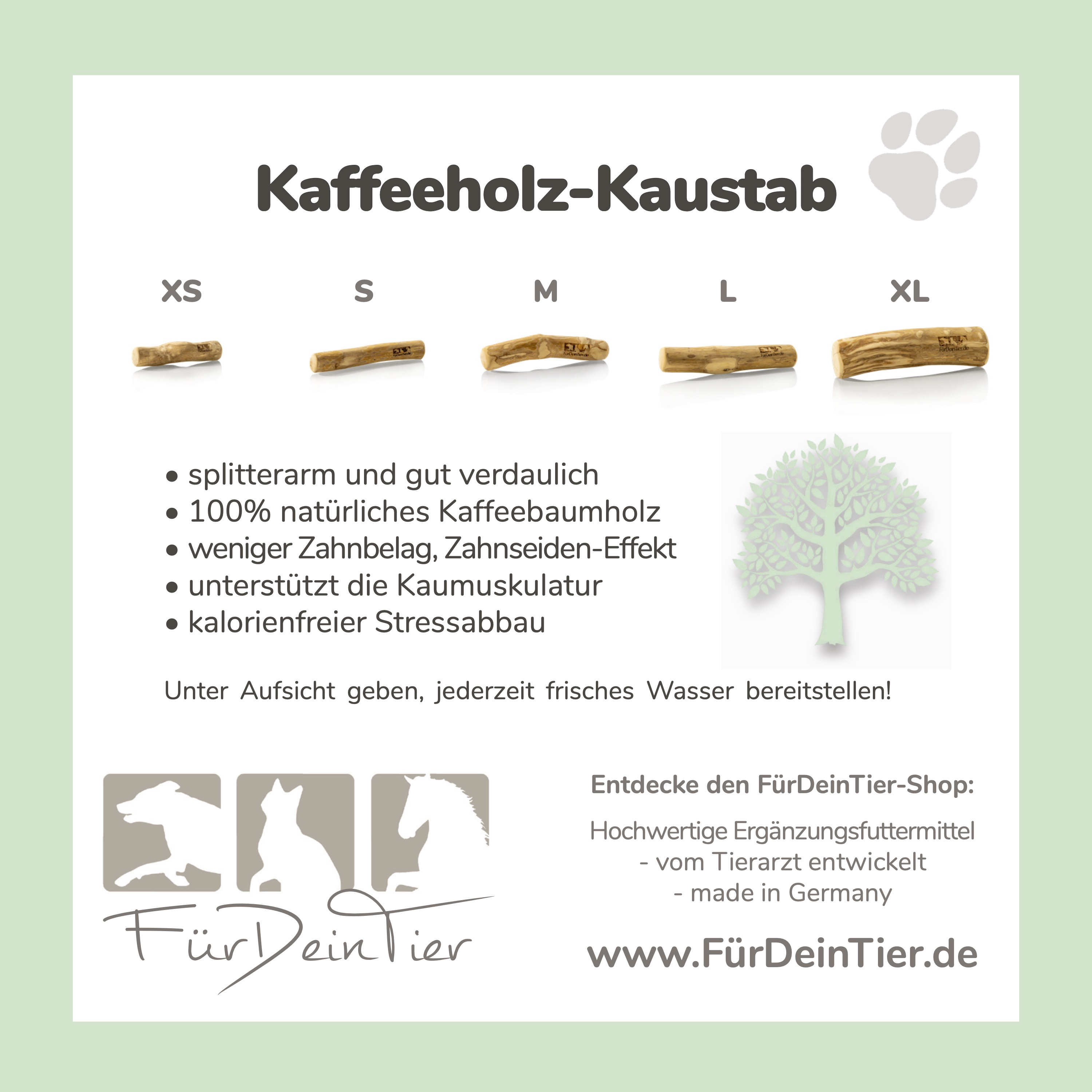Der Kaffeeholz-Stab von Für Dein Tier ist ein zu 100% natürlicher Kausnack aus besonders hartem Holz des Kaffeebaums. Ganz ohne künstliche Zusätze, ohne Kalorien – und natürlich plastikfrei verpackt! Hunde lieben es, darauf zu kauen – denn das befriedigt ihren natürlichen Kauinstinkt und bringt gleich mehrere Vorteile mit sich: